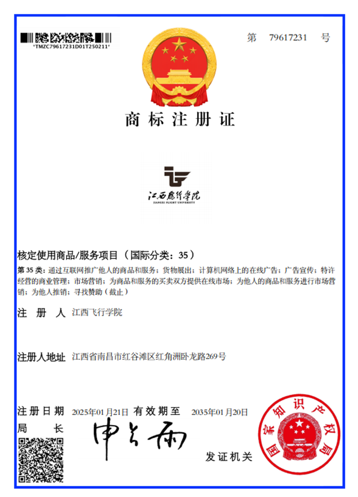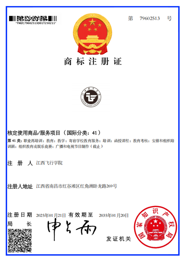 江西飞行学院校徽标识商标注册证载明为第35类(证书号:79606846,79617231)、第41类(证书号:79602513,79614848)两个国际分类,核定使用商品或服务项目20个。在此之前,这两组校徽标识图案作为美术作品完成国家版权局登记注册(证书号:国作登字-2024-F-00240075,国作登字-2024-F-00240076)。校徽标识图案获商标和版权登记双重注册后,未经授权许可,任何单位和个人均不得以商业为目的擅自使用或改变使用,否则将构成侵权并承担法律责任。