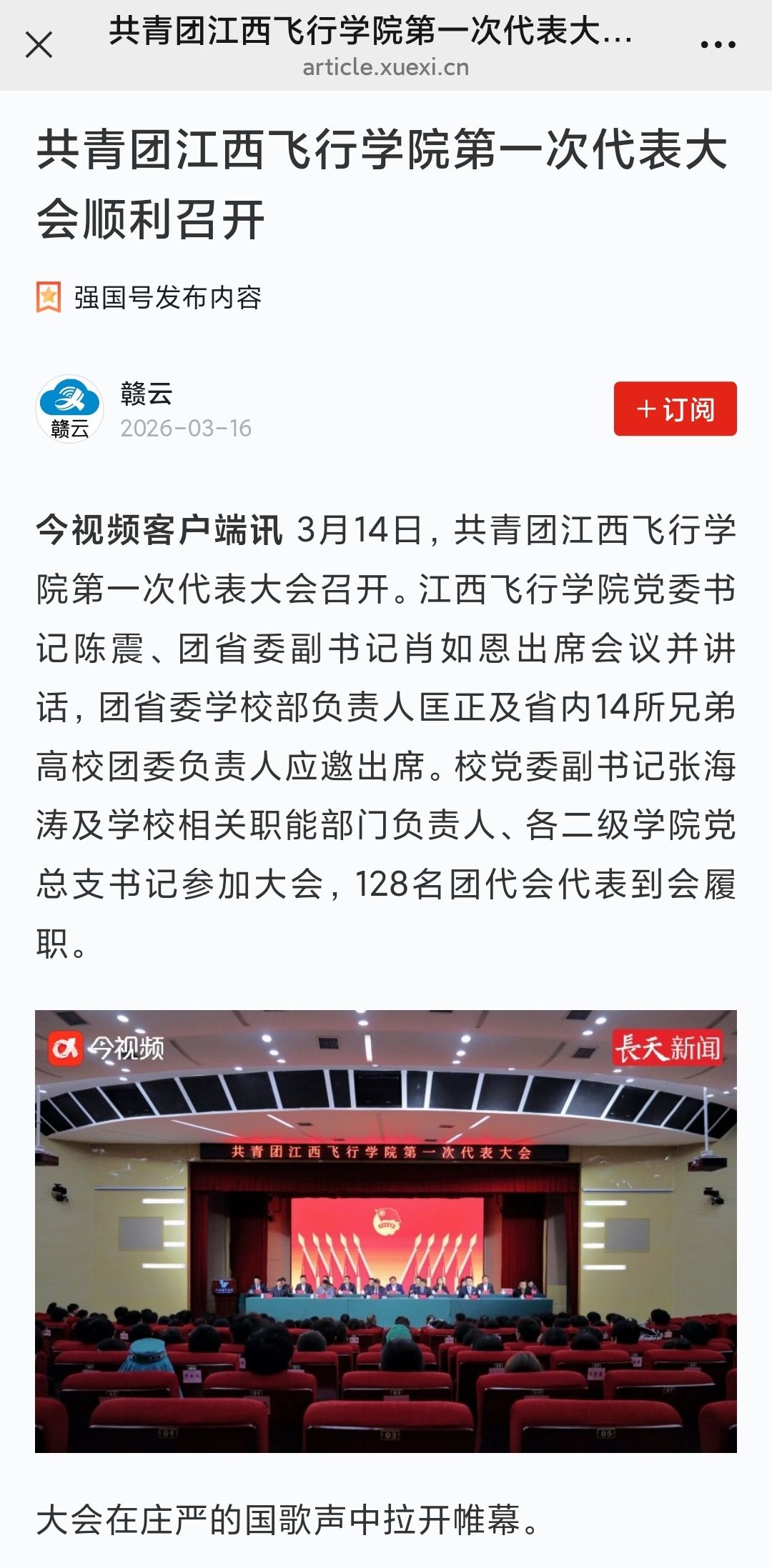 近日,学习强国报道,江共青团江西飞行学院第一次代表大会顺利召开详情如下: